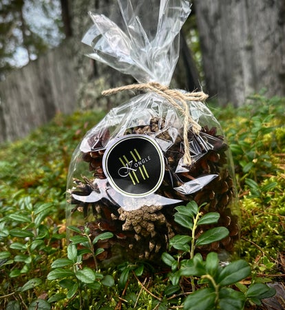 Pakken inneholder et utvalg norske, håndplukkede kongler, nøtter og lav etc. Det følger også med en liten nisselue og bjelle. Vekt ca. 200g